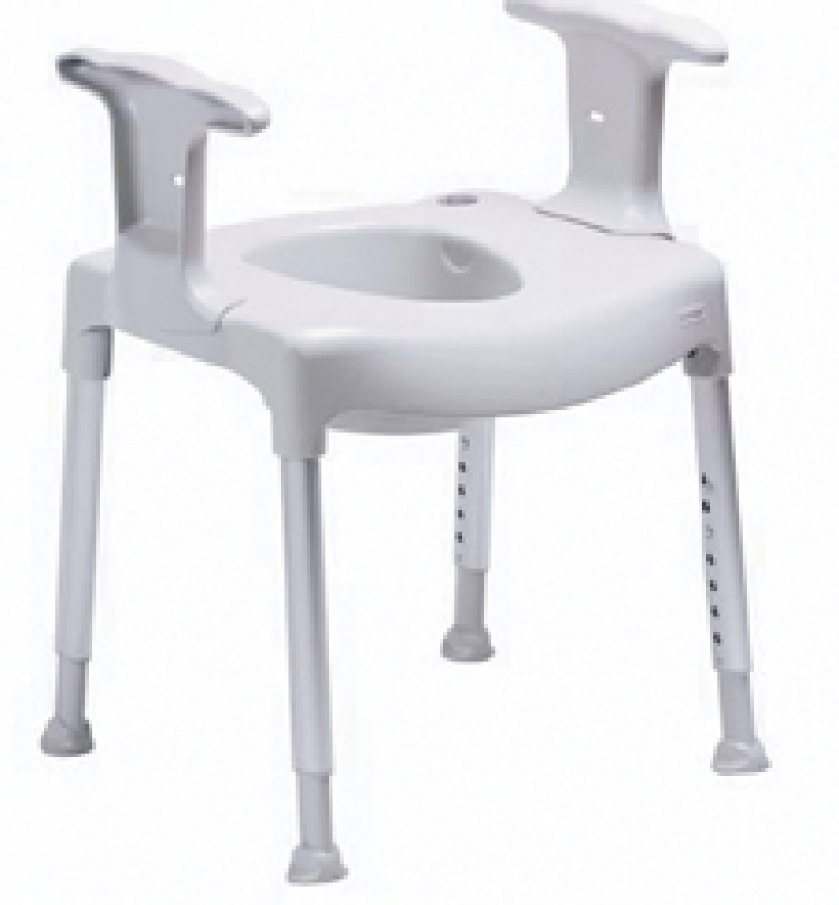 armsteunen zijn eenvoudig te verwijderen. Spatbescherming is in de zitting ingebouwd met een glad, eenvoudig schoon te maken oppervlak. Ook als douchekruk te gebruiken.
