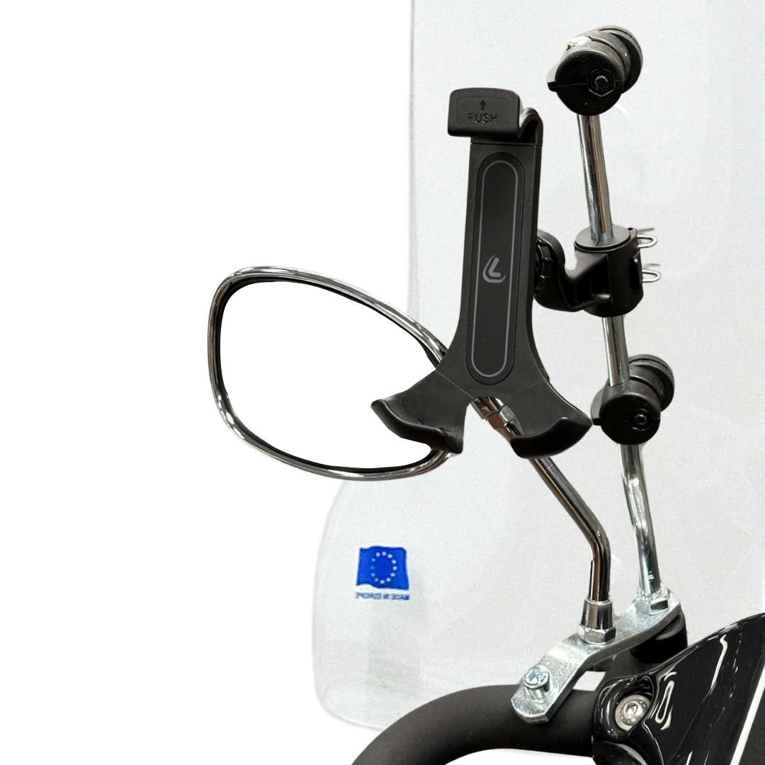 Universele smartphonehouder voor scootmobielen. Eenvoudig te monteren aan spiegel of windscherm, volledig verstelbaar en geschikt voor smartphones van 130–190 mm. Veilig, stabiel en ideaal voor navigatie onderweg.