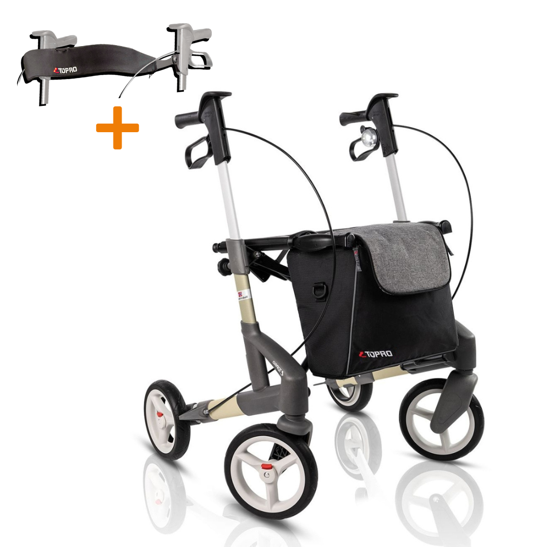 De TOPRO Ergo Grip handgrepen zijn ergonomisch ontworpen voor een comfortabele grip en ondersteunen een gezonde loophouding. Daarnaast bieden ze extra comfort bij het zitten. Voor extra veiligheid is er een handige bel, gemakkelijk te bedienen vanaf het handvat.